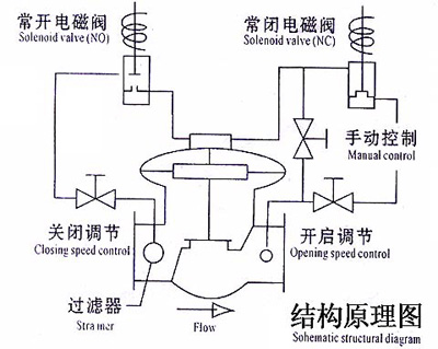 在管道輸送介質(zhì)過程中,當需要開啟閥門時,由計算機發(fā)出閥門開啟信號,常開電磁閥通電(關(guān)閉),同時常閉電磁閥通電(開啟)。這時,由上游通向主閥膜片上的腔室通道被截止,主閥膜片上腔室通向下游的通道被導通。此時,膜片下部 的壓力高于上部壓力,主閥膜片上的腔室的介質(zhì)通過常閉電磁閥通道排向下游管道,主閥被打開。