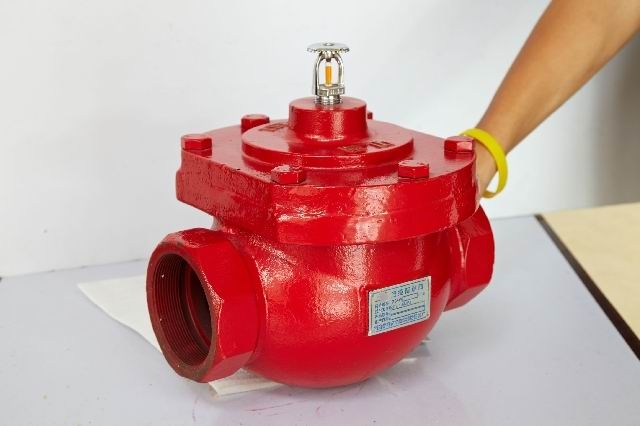 當(dāng)火災(zāi)發(fā)生時(shí),由于感溫噴頭受熱動(dòng)作造成控制腔壓力聚減而開(kāi)啟本閥,水流供向開(kāi)式或水幕噴頭噴灑水滅火。